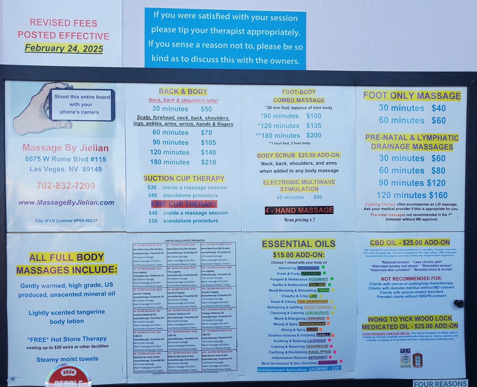A sample product tester at the Shengli Oil Field in the Shandong Province of China, Jielian also owned and op-erated a women's clothing store. Her interest in massage therapy was sparked by the influence of an uncle who practiced chiropractic medicine in the city of Dongying. After coming to the US, she took English Language courses at UNLV, then obtained her Reflexology Certification. She later completed the 550-hour course and received her massage license from the Nevada State Board of Massage Therapy. The Director of the NSBMT personally attended and spoke at her class graduation. Jielian also holds con-current massage licenses issued by the City of Las Vegas and the City of North Las Vegas.