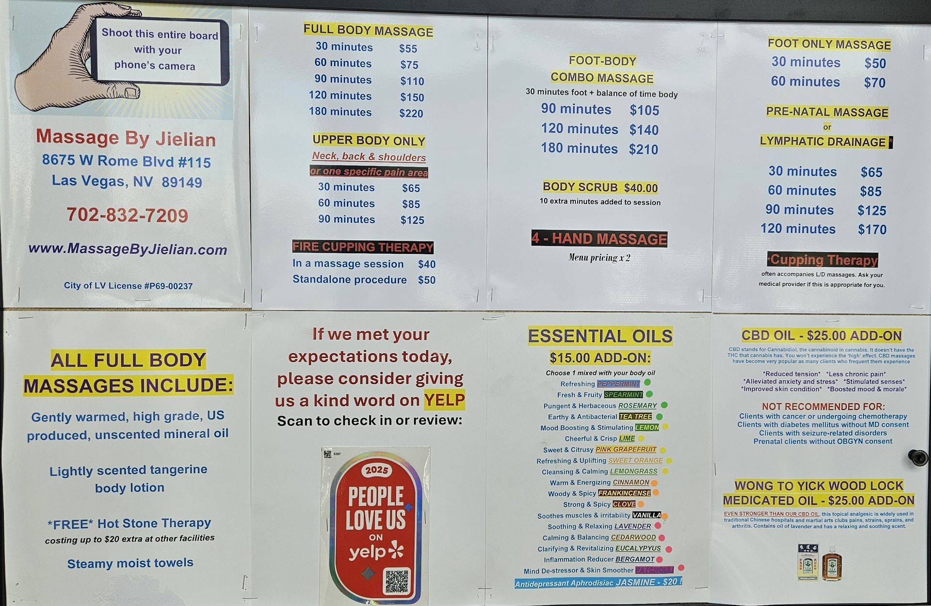 A sample product tester at the Shengli Oil Field in the Shandong Province of China, Jielian also owned and op-erated a women's clothing store. Her interest in massage therapy was sparked by the influence of an uncle who practiced chiropractic medicine in the city of Dongying. After coming to the US, she took English Language courses at UNLV, then obtained her Reflexology Certification. She later completed the 550-hour course and received her massage license from the Nevada State Board of Massage Therapy. The Director of the NSBMT personally attended and spoke at her class graduation. Jielian also holds con-current massage licenses issued by the City of Las Vegas and the City of North Las Vegas.
